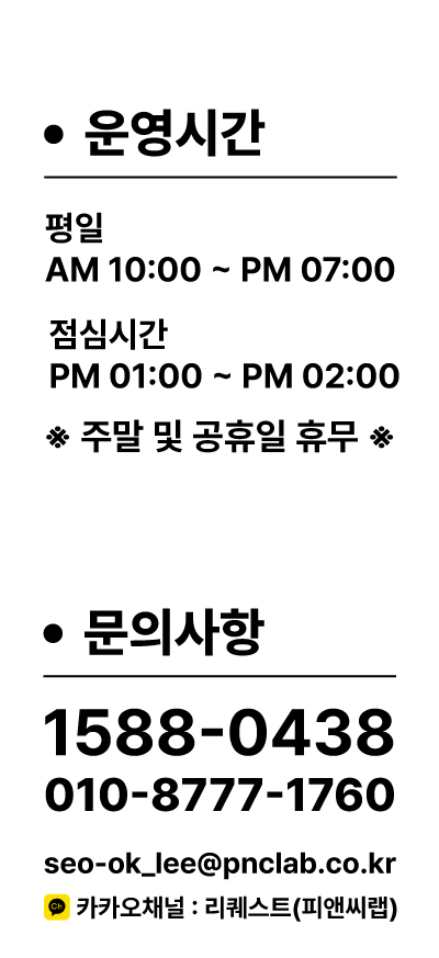 사업자등록번호 : 378-88-02248 ㅣ 대표전화 : 1588-0438 ㅣ pnc@pnclab.co.kr ㅣ통신판매번호 : 2022-의정부호원-0095